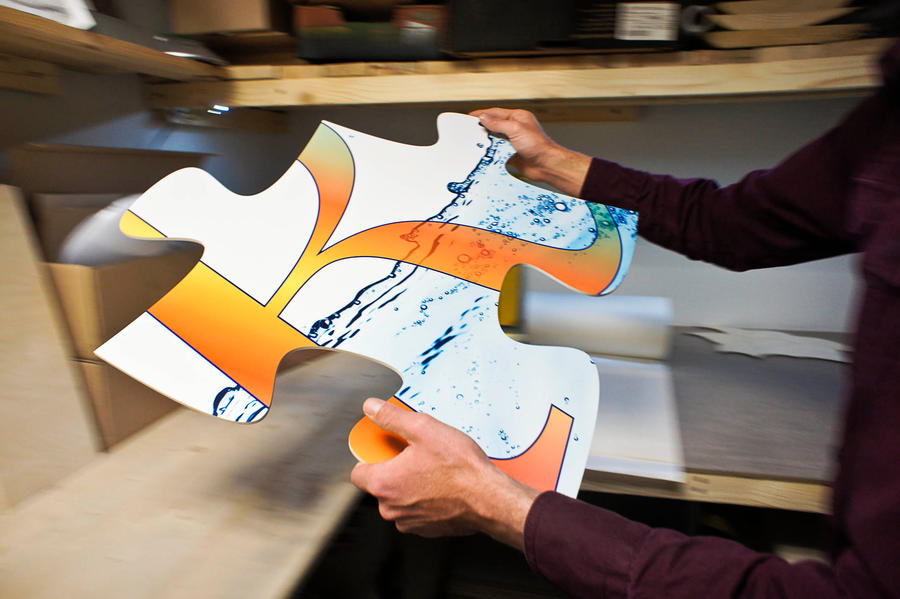 Unsere großen Holzpuzzle stellen wir hauptsächlich aus Holzplatten wie HDF oder Birkensperrholz her. Diese Holzwerkstoffe sind äußerst formstabil und dauerhaft, sie lassen sich absolut sauber und passgenau verarbeiten. Aus HDF stellen wir auch bedruckte Puzzleteile her, die auf Wunsch zusätzlich mit einer Schutzfoile versiegelt werden können. Für Aussenanwendungen und besonders große Formen verwenden wir den Kunststoff Forex und das UV Direktdruckverfahren.