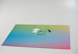 Das Verfahren für die Herstellung von Laserpuzzles haben wir selbst entwickelt, es können auch Puzzles hergestellt werden die größer sind als die Arbeitfläche unseres Lasercutters (50x80cm). Wir erstellen am Computer die Puzzleformen und passen diese auf Ihre Druckvorlagen an. Hochwertige Ausdrucke von Laserdruckmaschine und Tintenplotter werden auf Hartfaserplatten geklebt. Dazu verwenden wir die langlebige, doppelseitige Klebefolie von Neschen. Danach werden die Teile gelasert und zum gewünschten Format zusammengefügt.